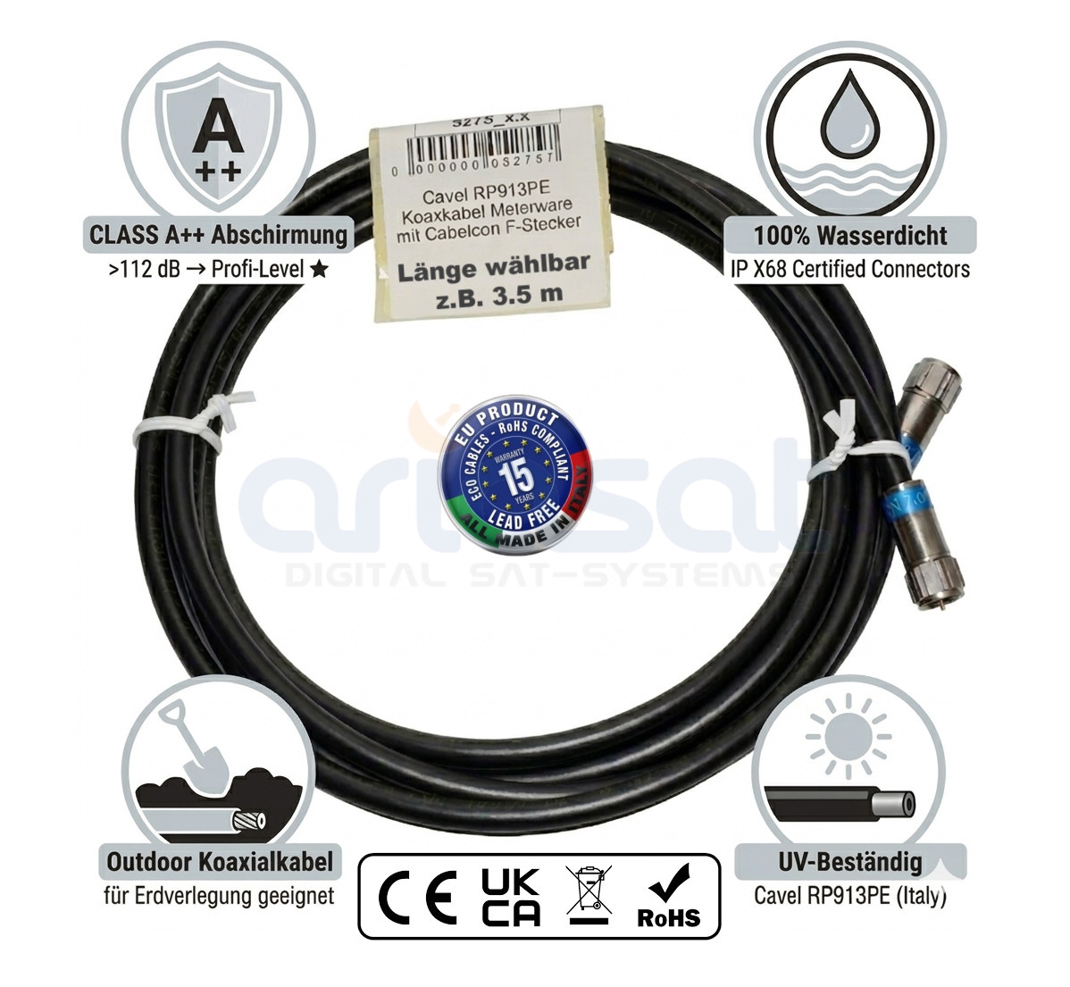 Suchen Sie die ultimative Lösung für Ihren Außenbereich? Dieses fertig konfektionierte High-End Koaxialkabel wurde speziell für härteste Bedingungen entwickelt. Ob auf dem Dach, am Balkon oder im Garten – die Kombination aus dem UV-beständigen Cavel RP913PE und den wasserdichten Cabelcon TrueDrop Kompressionssteckern garantiert einen störungsfreien Empfang über Jahrzehnte.